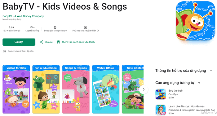 Hiện BabyTV – Kids Videos & Songs đã có mặt trên cả Google Play và App Store. Trên hệ điều hành Android dung lượng 12M với hơn 500.000 lượt tải về.