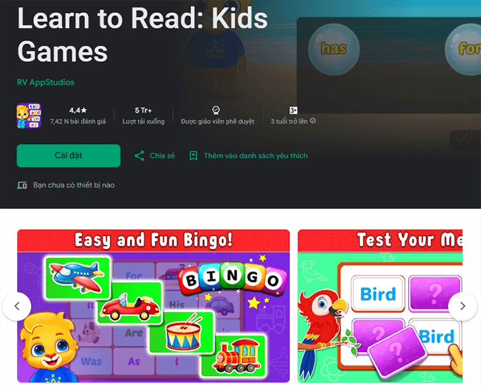 Learn to Read: Kids Games bao gồm các hoạt động vui nhộn như nối từ phù hợp với hình ảnh, tìm chữ cái còn thiếu, điền vào chỗ trống, nghe để chọn từ đúng,… Hình ảnh với màu sắc tươi tắn cùng âm thanh vui nhộn trên ứng dụng giúp bé tiếp thu hiệu quả hơn. Đây là phần mềm nhận được nhiều phản hồi tốt từ các bậc phụ huynh.