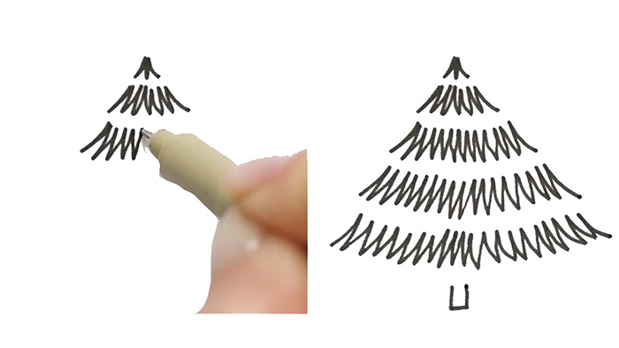 – Bước tiếp theo, vẽ hai đường thẳng song song để tạo phần thân cây và thực hiện trang trí theo ý thích. Có thể điểm theo một số hình tròn tượng trưng cho những quả cầu hay những ngôi sao trên đỉnh là đã hoàn thiện một cây thông Noel.