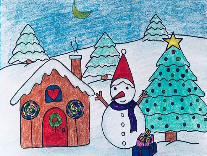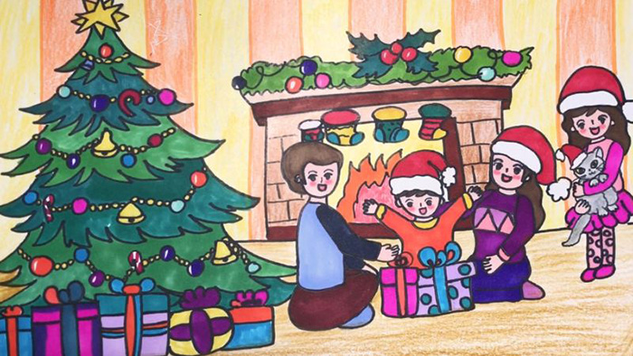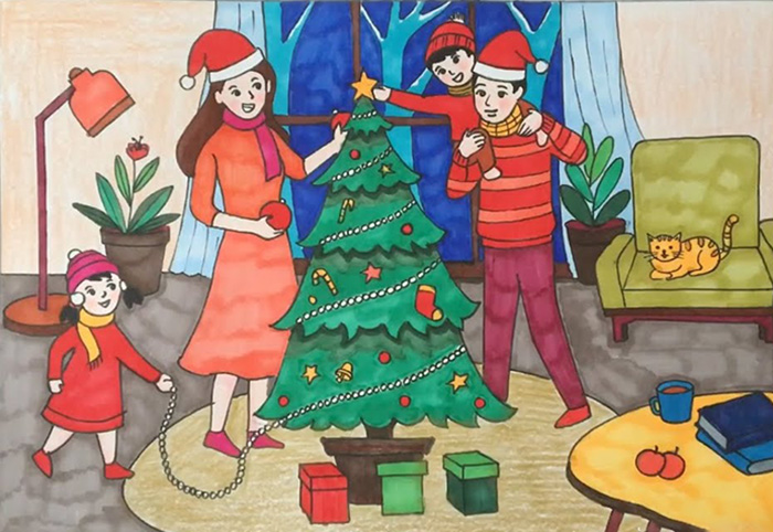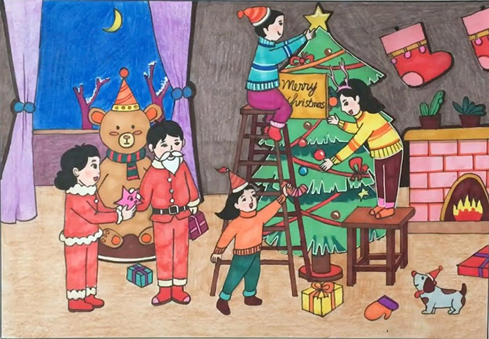 Giáng sinh là thời gian gia đình quây quần bên nhau cùng tận hưởng không khí ấm áp cuối năm. Vì vậy khi lựa chọn đề tài vẽ tranh Noel bé có thể tái hiện khung cảnh này trong bức vẽ của mình.