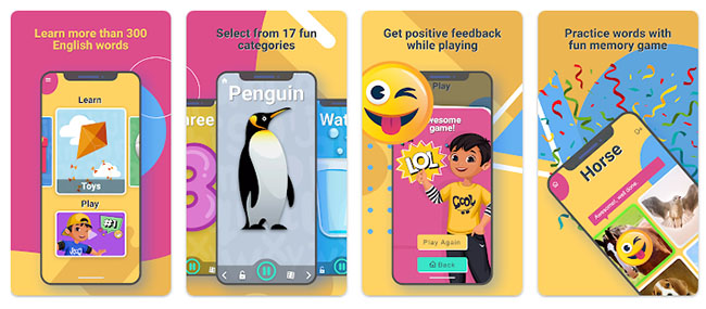 Là phần mềm luyện từ vựng tiếng Anh phù hợp với trẻ từ 3 tuổi trở lên với 4,3/5 sao từ gần 1000 lượt đánh giá trên Google Play. “300 từ tiếng Anh cho trẻ em” áp dụng phương pháp tương tác trực quan thông qua hình ảnh và âm thanh. Các chủ đề từ vựng phân theo từng chủ đề như: số lượng, màu sắc, công việc,.. giúp bé có thể chủ động học mà không cần tới sự hỗ trợ của cha mẹ.