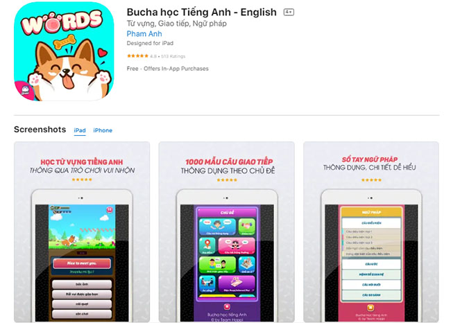 Bucha học tiếng Anh đóng vai trò hỗ trợ nâng cao vốn từ vựng cho bé, với bộ dữ liệu ôn tập đồ sộ lên tới hàng trăm bài học vui nhộn. Ứng dụng này nhận được tới 4,7/5 sao với hơn 75.3 nghìn lượt đánh giá của người dùng.