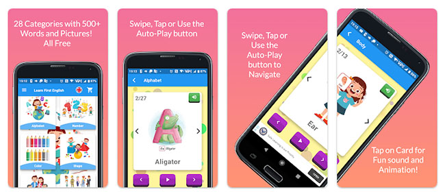 Flashcards từ vựng cho trẻ em là một ứng dụng thẻ học tiếng Anh thông minh được phát triển nhằm giúp bé có cơ hội được học từ vựng theo phong cách, sở thích riêng của bản thân. Với hơn 28 bộ thẻ học, đa dạng các chủ đề từ bảng chữ cái, số đếm, màu sắc,… hơn 500 từ vựng nhận được 4/5 sao đánh giá trên kho ứng dụng trực tuyến.