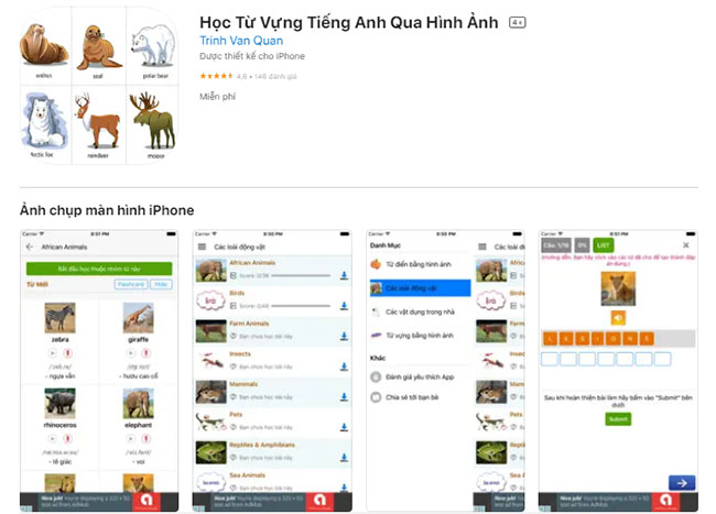 Sẽ là một thiếu sót khi nhắc tới những app học từ vựng mà bỏ qua “Từ Vựng Tiếng Anh Qua Hình Ảnh” có 4,6/5 sao đánh giá từ người dùng. Ứng dụng này được coi là công cụ học từ vựng hiệu quả thông qua các thẻ học thông minh, với nhiều lĩnh vực khác nhau. Cung cấp hệ thống từ vựng chuyên ngành giúp bé có cơ hội mở rộng vốn từ vựng một cách nhanh chóng.