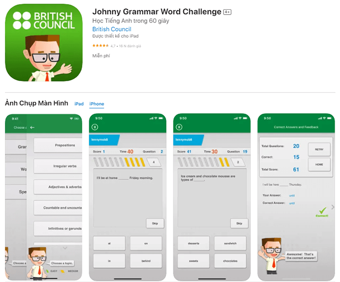 Johnny Grammar’s word Challenge hỗ trợ người dùng ôn tập và kiểm tra kiến thức tiếng Anh
