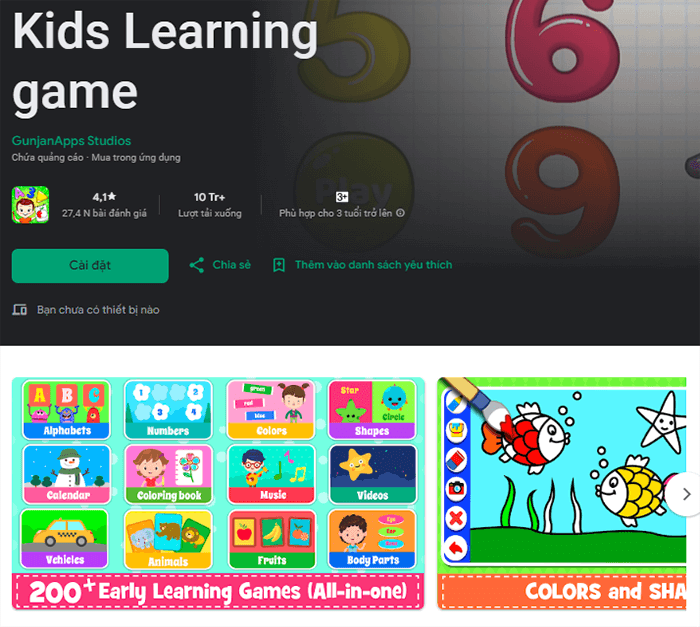 Kids Preschool Learning Game là một game tiếng Anh miễn phí cho trẻ em trong khoảng 3 – 6 tuổi. Giao diện trò chơi được thiết kế dễ thương, có nhiều màu sắc bắt mắt, và những hiệu ứng âm thanh vui nhộn, hấp dẫn. Đây đang là một trong những tựa game nổi tiếng, thu hút trẻ em vừa chơi vừa học tiếng Anh.