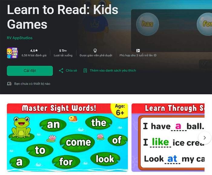 Learn to Read: Kids Games là một tựa game tiếng Anh miễn phí cho trẻ em sử dụng flashcard. Game có nhiều lựa chọn minigame được thiết kế xoay quanh khái niệm từ vựng để trẻ em ở độ tuổi từ 3 – 9 tuổi có thể học cách đọc các từ đơn giản.