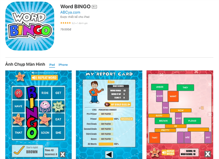 Nếu con bạn yêu thích trò chơi đố chữ, thì Word Bingo sẽ là một trong những lựa chọn mà bạn nên cân nhắc. Trò chơi này sẽ kích thích sự sáng tạo, và nâng cao vốn từ vựng của trẻ. Game còn có bảng xếp hạn thi đấu nên trẻ có thể cạnh tranh với bạn bè, đây là động lực cho trẻ cố gắng và phát huy tối đa năng lực về ngôn ngữ của mình.