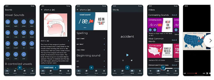 Đây không chỉ là một app di động, ‘English Pronunciation’ còn cung cấp nền tảng ứng dụng web để giúp bé nói chuẩn tiếng Anh. Mỗi bài học được bao gồm cách phát âm các nguyên âm ngắn dài, phụ âm đầu và âm câm.