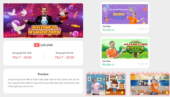 Lớp học Live Class được phát sóng vào hai khung giờ là 19h30 và 20h30 tối thứ 7 hàng tuần. Tuy nhiên, nếu không may bỏ lỡ thời gian phát sóng trực tiếp thì các con hoàn toàn có thể xem lại. Đánh giá khách quan thì đây chính là hoạt động chủ đạo khơi dậy hứng thú cho trẻ. Do đó, tính năng này của Babilala nhận được sự hưởng ứng từ 100% phụ huynh và học viên.