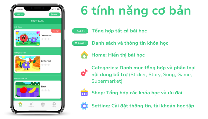 Mỗi cấp độ có tới 11 chủ đề, do đó các bé có thể thỏa sức khám phá. Từ những bài học đơn giản nhất như chữ cái, số đếm, chào hỏi đến bài học về sở thích, đồ ăn, phương tiện giao thông,… đều rất gần gũi và thiết thực.