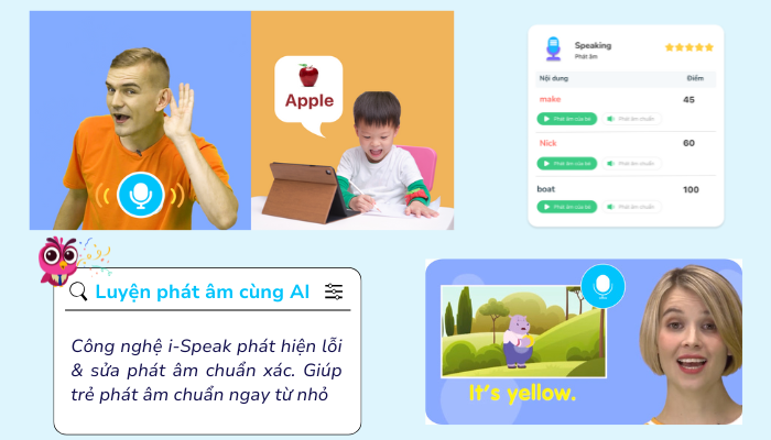 – Công nghệ luyện phát âm i-Speak: Sử dụng công nghệ AI ghi âm giọng đọc, phát hiện lỗi và chấm điểm chuẩn xác. Giúp trẻ phát âm chuẩn ngay từ nhỏ.