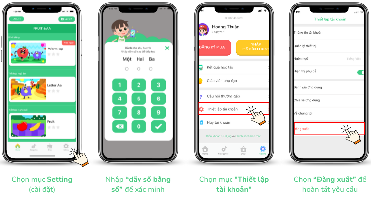 Để đăng xuất tài khoản, ba mẹ thực hiện theo các bước sau: