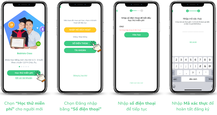 – Nếu là người dùng mới: Ba mẹ chọn “Học thử miễn phí”, tiếp theo chọn đăng nhập bằng số điện thoại và thực hiện các thao tác tiếp theo để bắt đầu học thử miễn phí.