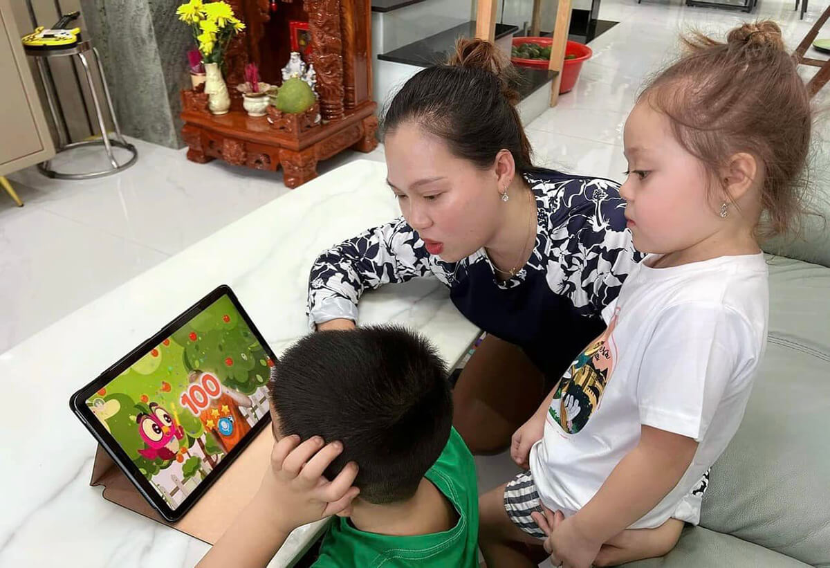 Hình ảnh các bé Jade và anh họ chăm chú học tiếng Anh được chị Ngọc chia sẻ trên facebook